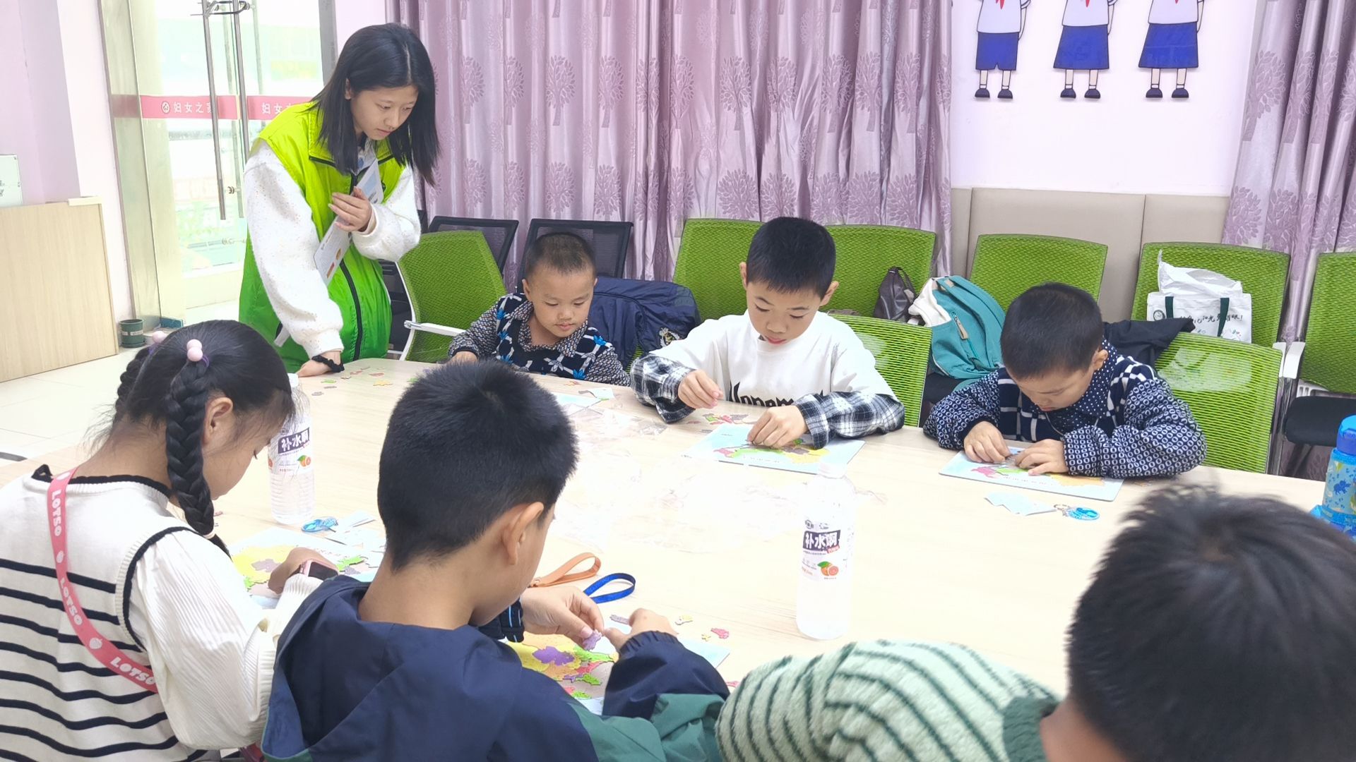 宣讲结束后,互动提问环节顺势推进。“塞罕坝原来是什么样子呀?”等简单问题引发小朋友踊跃回应,答对者获赠小贴纸,现场氛围热烈。答对的小朋友获赠小贴纸,进一步调动了参与热情,也帮助小朋友巩固了宣讲所学知识。互动提问环节落幕,开展趣味拼图游戏。志愿者为每位小朋友发放“荒漠变林海”卡通拼图,大家专注拼接、互帮互助,快速完成拼图任务。游戏总结时,志愿者吴晓雨以“小树苗长大不容易”为喻,结合拼图成果讲解塞罕坝造林的艰辛,让小朋友切实体会绿色的珍贵。