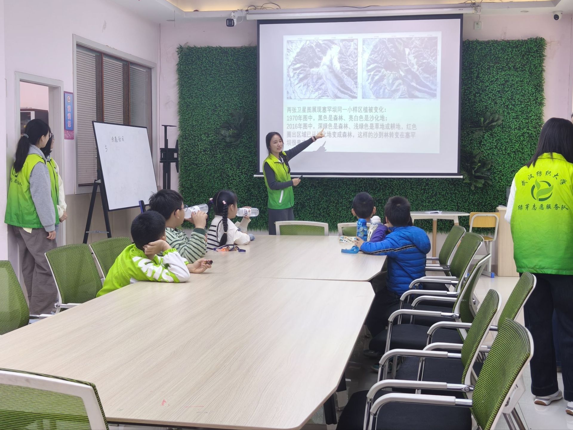 活动开始,三名宣讲人以PPT宣讲为核心,轮流用生动易懂的方式讲述塞罕坝“变身故事”:通过荒漠与林海的卡通对比图,搭配“沙漠爸爸”变“森林爷爷”的趣味表述,结合动画短片呈现三代造林人克服困难种树的历程,让小朋友直观感受塞罕坝的蜕变。随后,志愿者吴玥萱用“坚持种树的决心”“不怕辛苦的勇气”“爱护绿色的习惯”童趣解读塞罕坝精神,穿插励志小故事加深理解,并引导小朋友践行浇水护花、节约用纸、不乱扔垃圾等简易绿色行动。