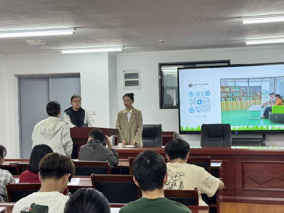 在宣讲环节,叶宇轩老师重点介绍了学科特色、硕士点建设、导师队伍及科研平台优势,结合湖北师大城环学院在地理学、环境科学与工程领域的学科基础,针对性解读 2026 年招生政策、培养方案与奖助体系。在后续的互动环节,同学们针对26年学院的报考政策进行了提问,现场氛围热烈。